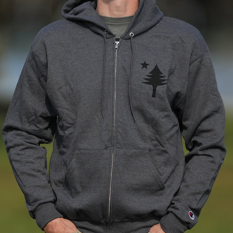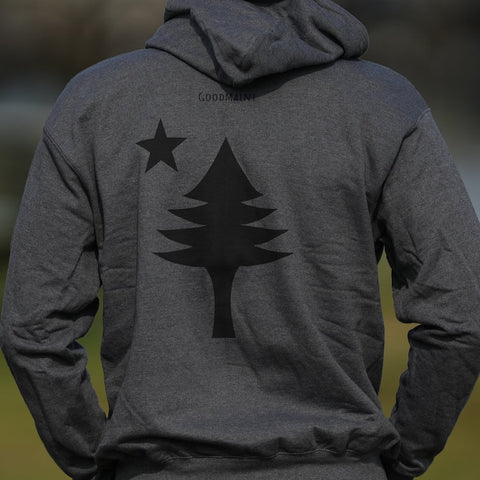 This design is the state of Maine’s first official flag, used from 1901-1909. The star on the flag represents the North Star and the tree represents the great White Pine, Maine’s official state tree. Printed by Maine Screen Printers, Co. in South Portland, Maine.
