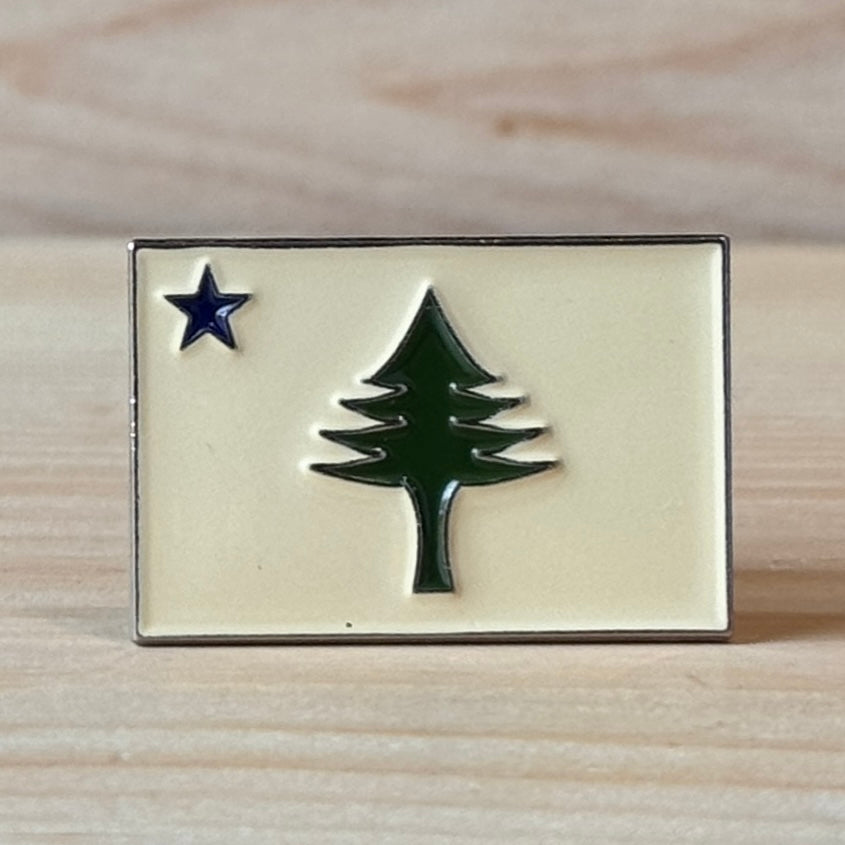 This design is the state of Maine’s first official flag, used from 1901-1909. The star on the flag represents the North Star and the tree represents the great White Pine, Maine’s official state tree. Printed by Maine Screen Printers, Co. in South Portland, Maine.