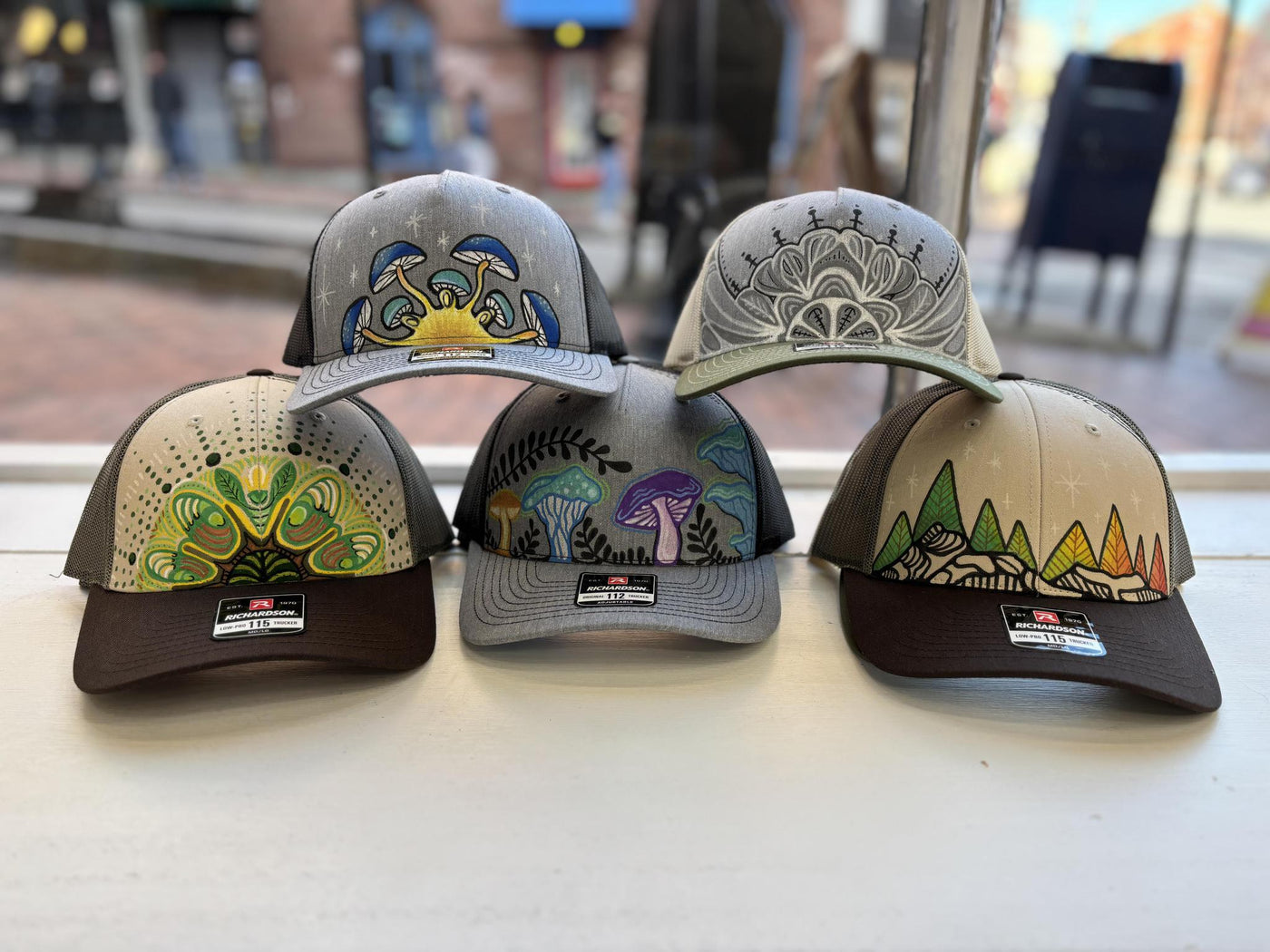 One of a kind hats hand-painted by Nicole, a Portland-based artist and owner of Wild Slice designs.