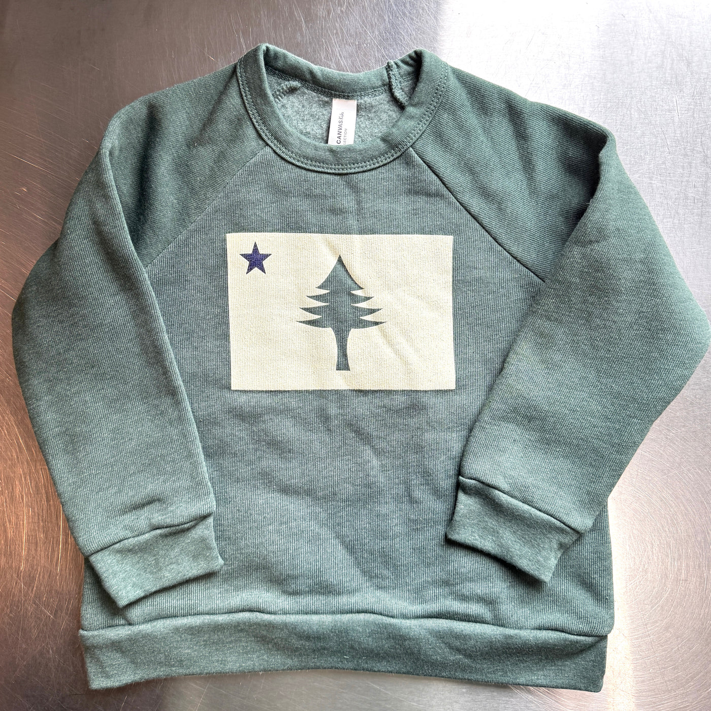 This design is the state of Maine’s first official flag, used from 1901-1909. The star on the flag represents the North Star and the tree represents the great White Pine, Maine’s official state tree. Printed by Maine Screen Printers, Co. in South Portland, Maine.
