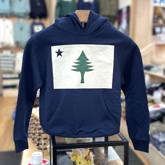 This design is the state of Maine’s first official flag, used from 1901-1909. The star on the flag represents the North Star and the tree represents the great White Pine, Maine’s official state tree. Printed by Maine Screen Printers, Co. in South Portland, Maine.